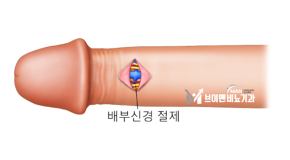 음경의 감각을 담당하는 신경을 배부신경이라 합니다. 이 배부신경은 귀두에 집중되어 있습니다. 귀두가 과민하여 사정을 빨리하는 경우 치료하기 위한 수술적 방법입니다. 배부신경이 둔해지면 성기에서 받아들이는 자극의 유입량이 일부 줄어들어 사정시간을 지연시킬 수 있습니다.