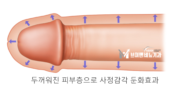 음경의 말단인 귀두 부위는 얇은 점막층 피부로 이루어져 있습니다. 예민한 점막층 피부와 신경층 사이에 단백질 성분의 생체물질을 주입하여 피부층과 융합을 이룹니다. 이 시술로 두꺼워진 페니스의 감각이 무뎌져 사정시간을 지연시켜주게 됩니다. 비수술적인 방법으로 큰 외상이 없기 때문에 어떤 조루치료보다 안전하며 합니다. 크기 확대와 함께 조루 치료를 동시에 얻을 수 있는 1석2조의 시술법입니다.